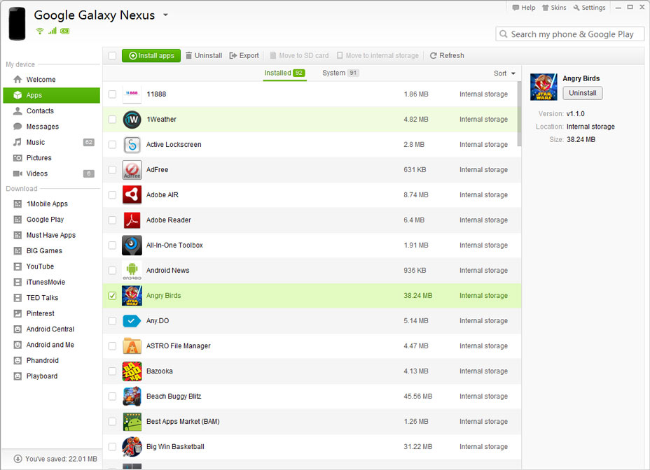 • Εγκατάσταση νέων εφαρμογών. Το SnapPea σας επιτρέπει να εγκαταστήσετε στο κινητό σας εφαρμογές απο πολλά διαφορετικά Markets συμπεριλαμβανομένου του Google Play αλλα και του 1Mobile, χρησιμοποιώντας τη σύνδεση του υπολογιστή σας. Μια πολύ καλή λύση για να εγκαταστήσετε εφαρμογές αν δεν έχετε WiFi διαθέσιμο.