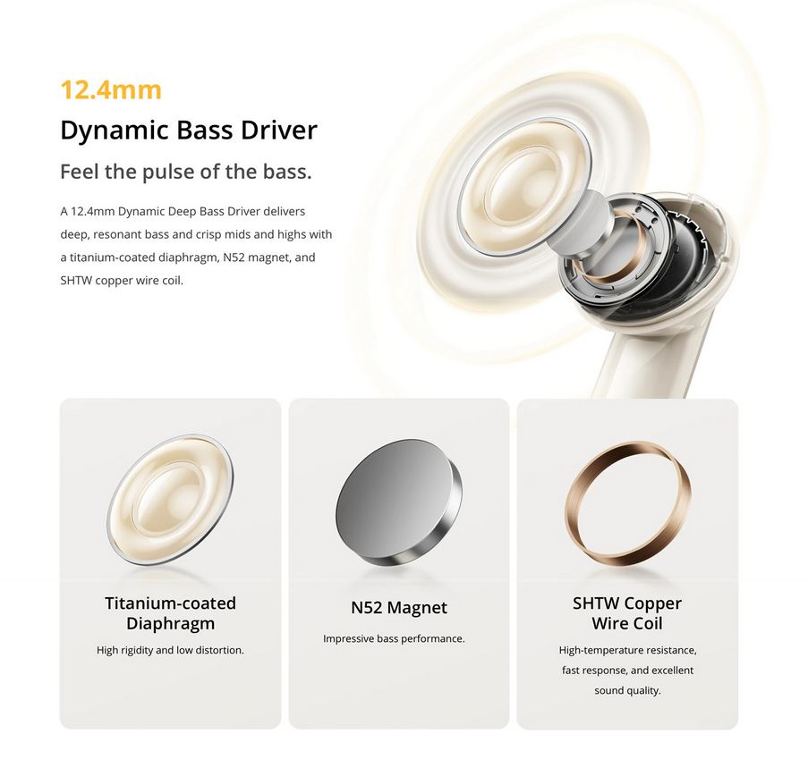 Η ποιότητα του ήχου είναι ένα από τα βασικά σημεία δύναμης των Buds Air7. Οι δυναμικοί μετατροπείς 12.4mm, σε συνδυασμό με την υποστήριξη LHDC για Hi-Res Audio, προσφέρουν βαθύ μπάσο και καθαρές μεσαίες-υψηλές συχνότητες. Το 3D Surround Sound δημιουργεί μια τρισδιάστατη ακουστική εμπειρία, ιδιαίτερα χρήσιμη σε ταινίες ή βιντεοπαιχνίδια, χάρη στην delay μόλις 45ms σε λειτουργία Gaming Mode.