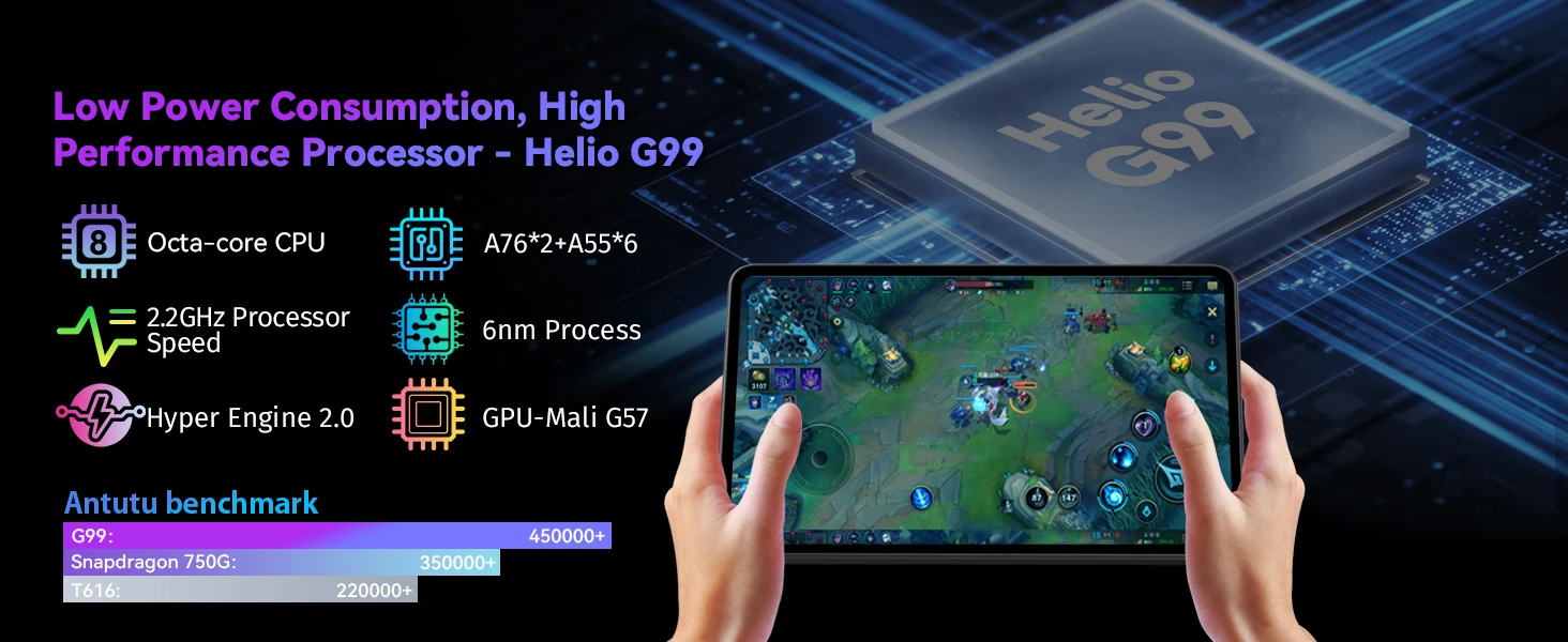 Στην καρδιά του Headwolf HPad 6, θα βρείτε τον Helio G99, που ειναι το δεύτερο μεγάλο όπλο του tablet, αφού σε αυτή την κατηγορία μεγέθους και τιμών, συνήθως βρίσκουμε τους Unisoc T6** που είναι σαφώς υποδεέστεροι σε σχέση με τον δοκιμασμένο , και πολύ ικανό επεξεργαστή της Mediatek.