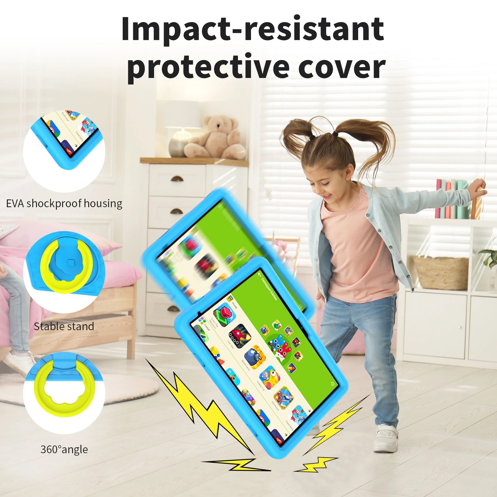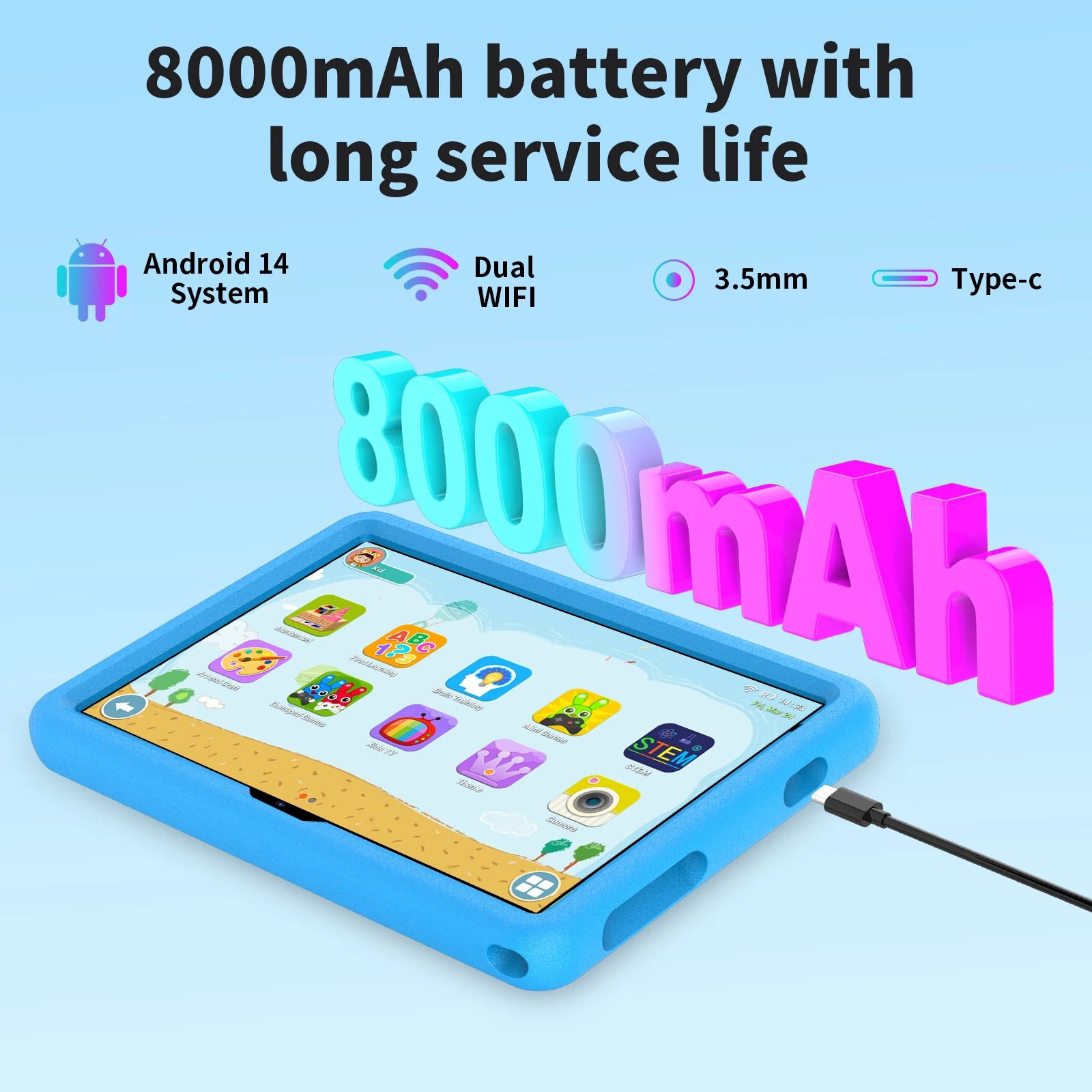 Το tablet έχει σχεδιαστεί ειδικά για παιδιά, με ανθεκτική θήκη σιλικόνης που προστατεύει από πτώσεις και χτυπήματα, καθώς και λαβή-στήριγμα για άνετη χρήση στο τραπέζι ή στο χέρι. Διαθέτει επίσης γονικό έλεγχο, επιτρέποντας στους γονείς να ρυθμίζουν το χρόνο χρήσης, το περιεχόμενο και τις εφαρμογές.