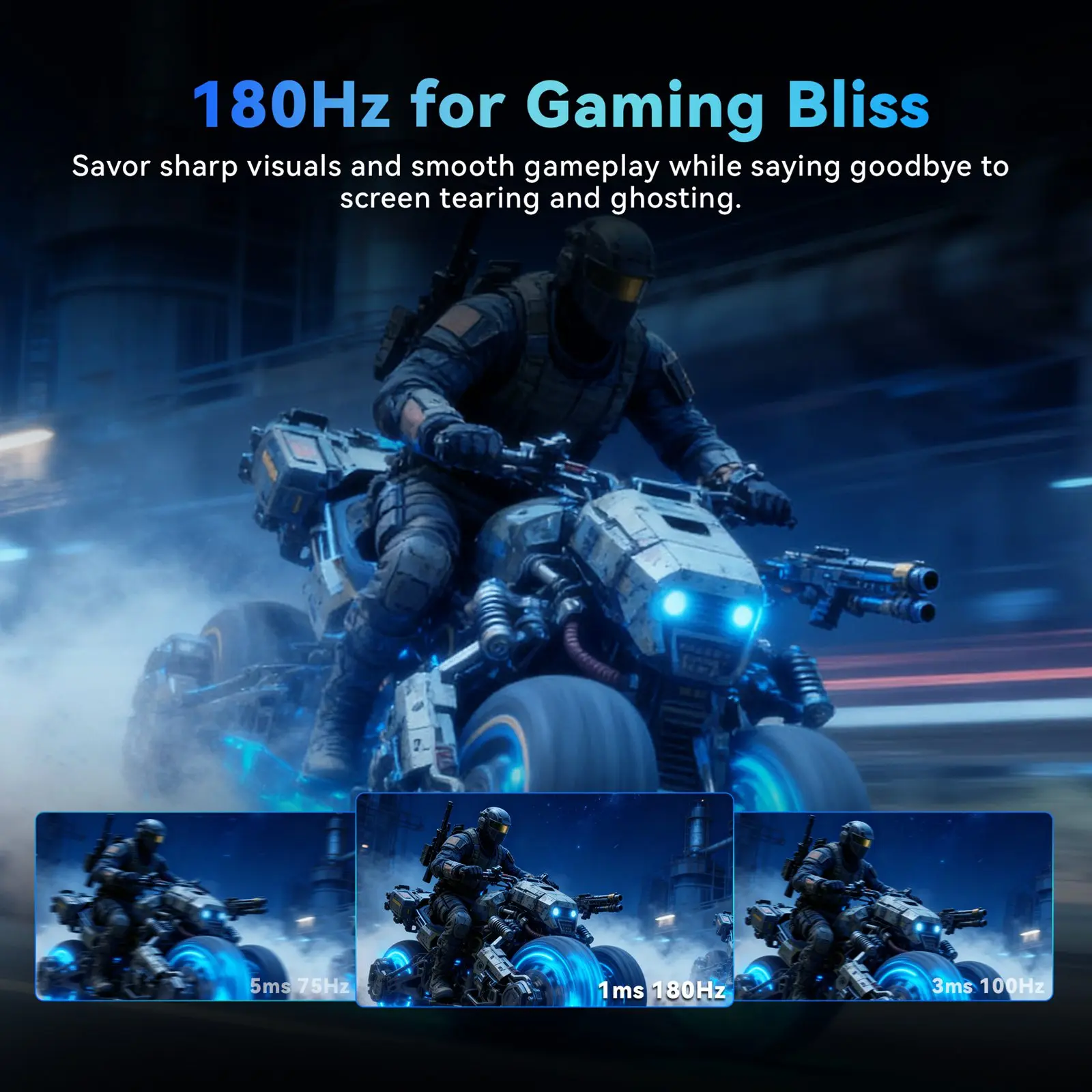 Η οθόνη τρέχει στα 180Hz, εκτός αν χρησιμοποιήσετε την HDMI θύρα, εκεί που θα δείτε μέχρι 100hz, και η διαφορά στην ομαλότητα θα σας φανεί χαοτική ακόμα και όταν απλά κουνάτε το ποντίκι αν έρχεστε απο ένα συμβατικό monitor 60/75hz.. Υποστηρίζει FreeSync και G-Sync Compatible λειτουργίες, οπότε το tearing στα παιχνίδια θα αποτελεί παρελθόν, αρκεί να μην περιμένετε επιδόσεις esports τουρνουά.