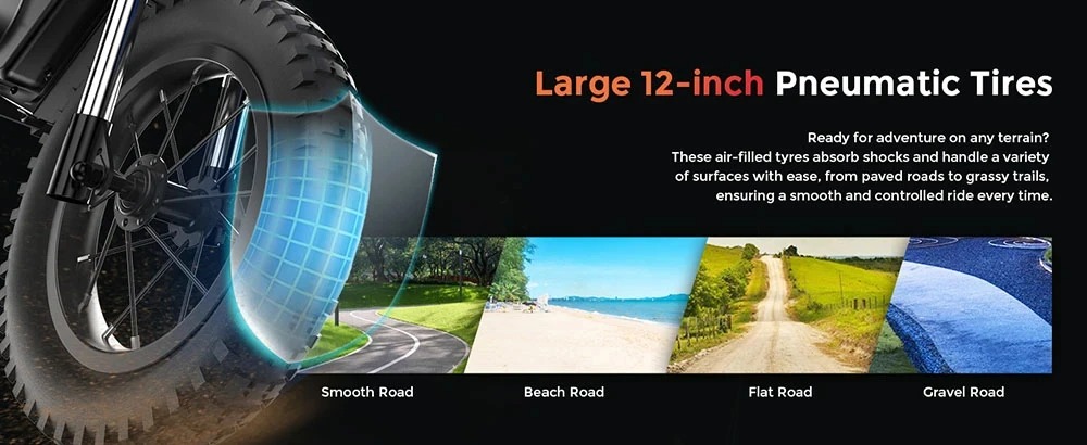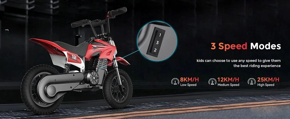Οι 12 ιντσών τροχοί προσφέρουν καλή σταθερότητα και ευελιξία σε αστικό περιβάλλον, ενώ η μέγιστη υποστηριζόμενη φόρτωση είναι 70 κιλά, καθιστώντας το κατάλληλο για παιδιά δημοτικού ή προεφηβείας. Η μέγιστη ταχύτητα παραμένει σε ασφαλή επίπεδα για τη συγκεκριμένη ηλικιακή ομάδα, προσφέροντας ταυτόχρονα αίσθηση “μοτοσυκλέτας” για τους μικρούς αναβάτες.