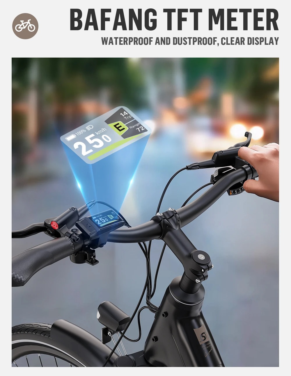 Ο BAFANG mid-drive κινητήρας αποτελεί μεγάλο πλεονέκτημα έναντι των κλασικών hub motors, καθώς προσφέρει καλύτερη κατανομή βάρους, περισσότερη ροπή στις ανηφόρες και φυσικότερη αίσθηση οδήγησης. Επιπλέον, το σύστημα υποβοήθησης πολλών επιπέδων επιτρέπει να επιλέγεις ανάμεσα σε οικονομική ή πιο “sporty” λειτουργία, ανάλογα με τη διαδρομή.
