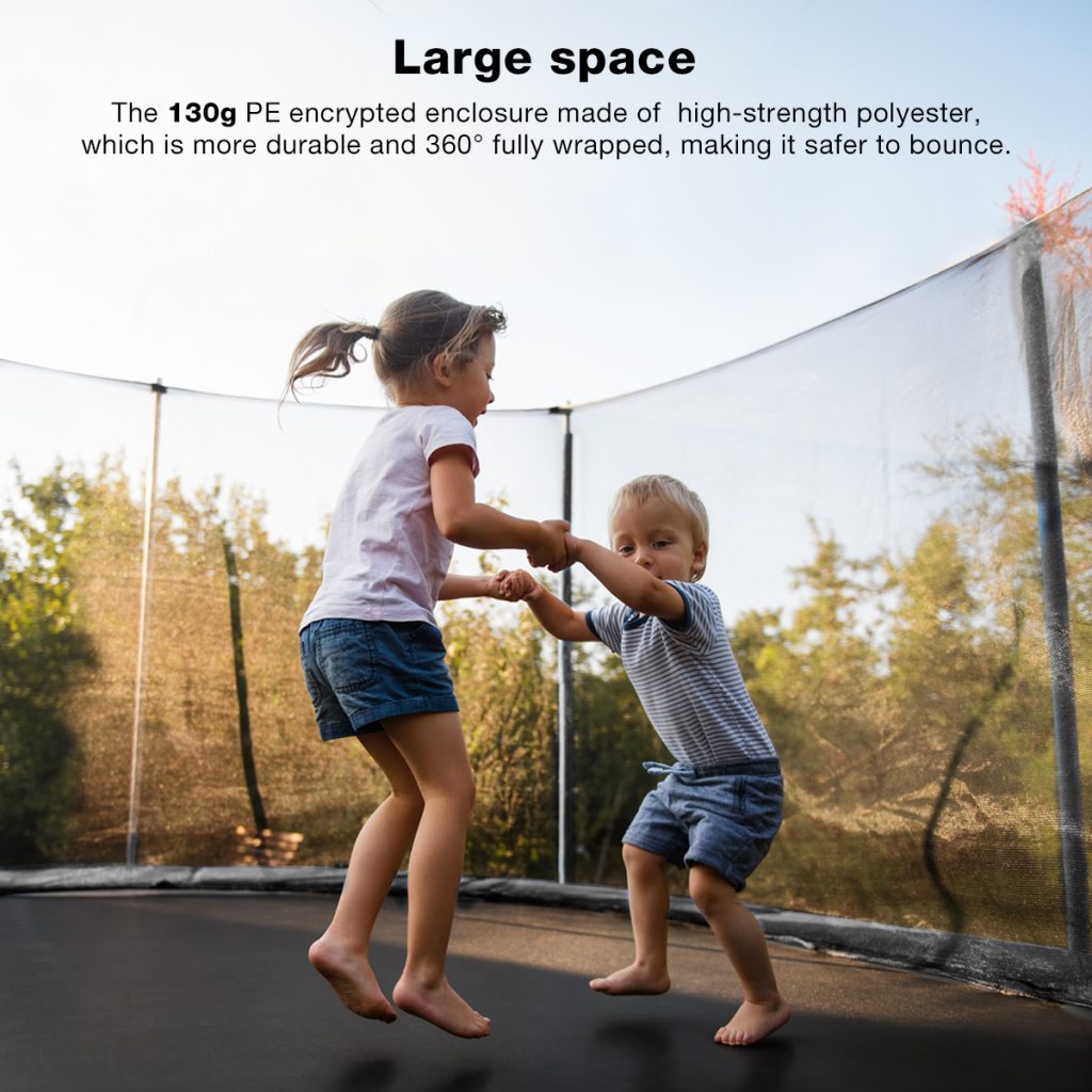 Στη συσκευασία, θα βρείτε ένα χοντρό κάλυμμά για τα ελατήρια, πάχους 2 εκατοστών, καθώς και ένα περιφερειακό δίχτυ προστασίας, ύψους 1.8 μέτρων, που στηρίζετε σε 8 στύλους, οι οποίοι έχουν κάλυμμά με μαξιλάρι, ώστε ακόμα και μετωπική με τον στύλο να φάει ο κανακάρης σας, να μην έχει κανένα πρόβλημα.