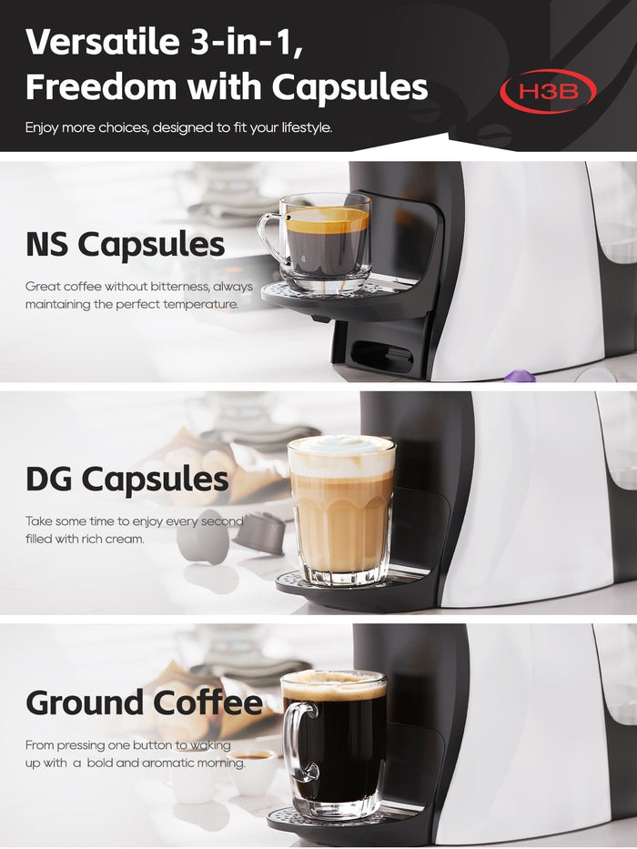 Η HIBREW H3B είναι μια από αυτές τις μηχανές που απευθύνονται στον αναποφάσιστο καφέ-λάτρη: σου αρέσουν οι κάψουλες Nespresso αλλά έχεις μερικές Dolce Gusto στο ντουλάπι; Ή μήπως καμιά φορά θέλεις και αλεσμένο; Εδώ δεν χρειάζεται να διαλέξεις – γιατί τα έχει όλα.