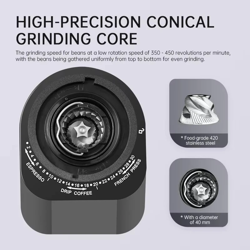 Το μεγάλο της όπλο είναι φυσικά ο μύλος άλεσης που θα βρείτε στο πακέτο. Δεν χρειάζεται να ψάχνεις για ξεχωριστές συσκευές και καλώδια, αφού ρίχνεις τους κόκκους στο δοχείο των 100 γραμμαρίων στην κορυφή και ξεμπερδεύεις. Ο μύλος διαθέτει κωνικά μαχαίρια και σου δίνει τη δυνατότητα να διαλέξεις ανάμεσα σε 30 διαφορετικά επίπεδα άλεσης, για να βρεις ακριβώς το σημείο που ταιριάζει στο χαρμάνι σου, ή απλά για να μπερδευτείς μέχρι να το πετύχεις.